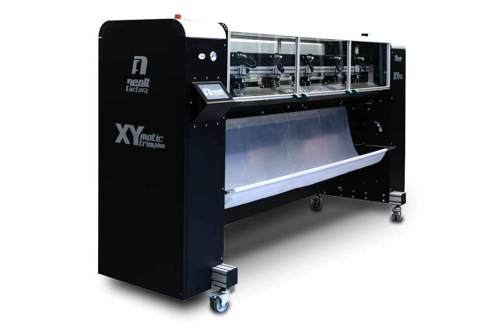 Neolt XY Matic Trim Plus cuts on the four sides simultaneously of flexible materials. Automatic adjustment of vertical and horizontal cutting. LCD touchscreen display, double sensor to read cross-marks.